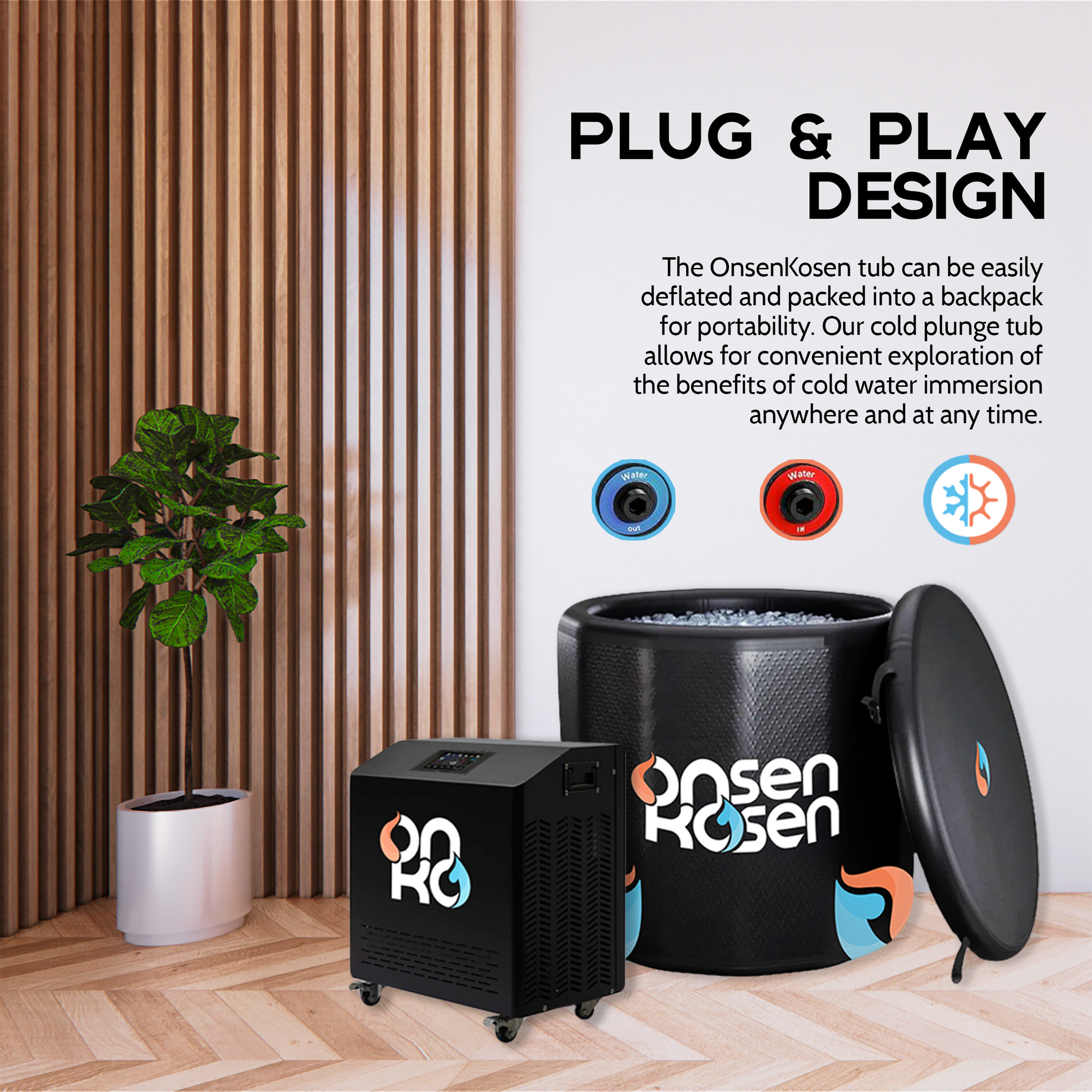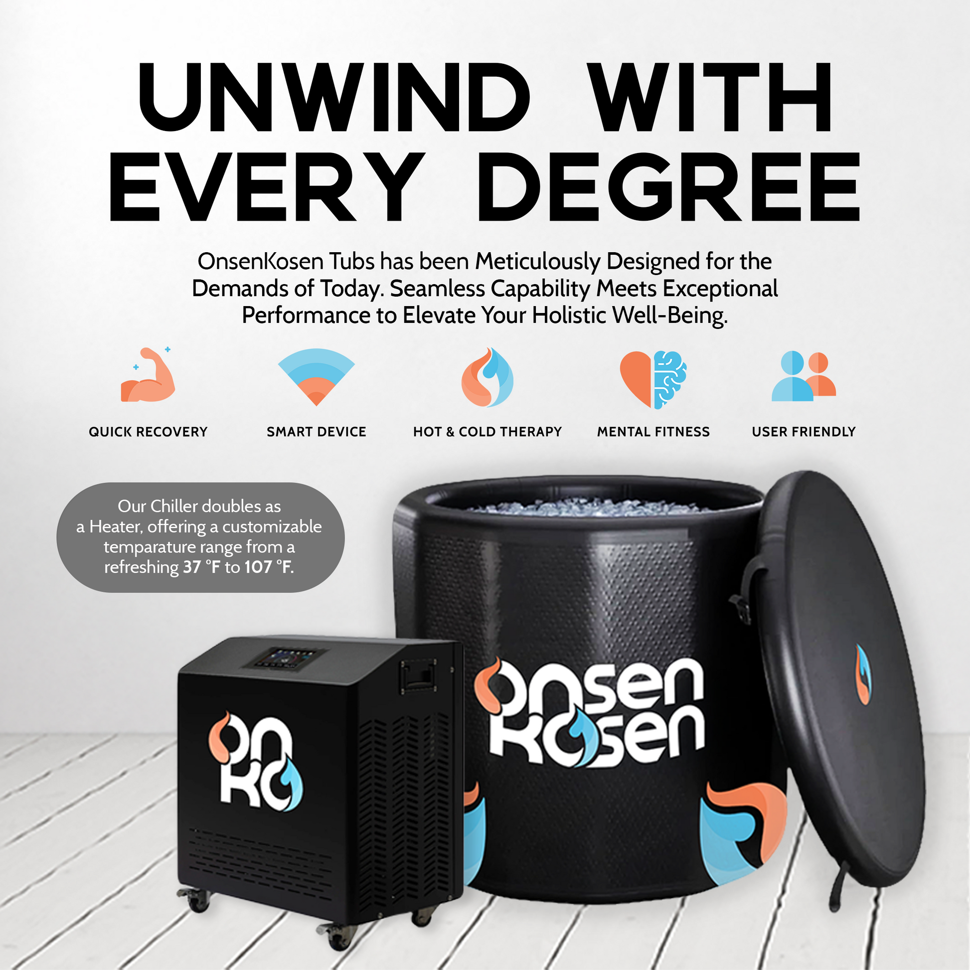Introducing our OnsenKosen Atami 1 Person Therapy Tub with Pro 2HP Dual Chiller/Heater. This spacious hot spa/cold plunge therapy is designed to reduce inflammation, ease muscle soreness, improve sleep quality, and accelerate recovery. Its durable construction ensures longevity and provides ample comfort for 1 person standing up in the Cold Plunge. With easy 15-minute setup and portability, you can now enjoy the benefits of cold therapy anytime + anywhere. Invest in your well-being with our premium OnsenKosen Atami 1 Person Therapy Tub, your go-to tool for optimal health and performance year-round. From 37°F to 104°F, our Commercial Grade Pro 2HP Dual Chiller/Heater can adjust the water temperature within 2-3 hours.